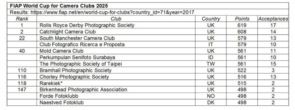 Here is the result of the 2025 FIAP World Cup for Camera Clubs giving just the UK